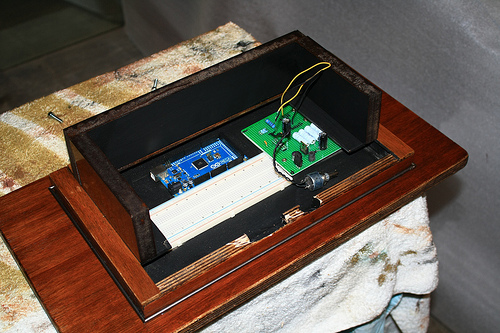 /* * Program for the Hazardous Physics ZM1042 nixie tube clock. K155ID1-based, no multiplexing. * All clock functions by Chris Gerekos. * Music playing (Wave library + code for playing + SD card errors check) by Adafruit, http://learn.adafruit.com/adafruit-wave-shield-audio-shield-for-arduino/ * Last updated 01/04/2014. */ // SN74141 : Truth Table //D C B A # //L,L,L,L 0 //L,L,L,H 1 //L,L,H,L 2 //L,L,H,H 3 //L,H,L,L 4 //L,H,L,H 5 //L,H,H,L 6 //L,H,H,H 7 //H,L,L,L 8 //H,L,L,H 9 #include <EEPROM.h> #include <FatReader.h> #include <SdReader.h> #include <avr/pgmspace.h> #include "WaveUtil.h" #include "WaveHC.h" #include <Wire.h> #include "RTClib.h" RTC_DS1307 RTC; // Real time clock. SdReader card; // This object holds the information for the card. FatVolume vol; // This holds the information for the partition on the card. FatReader root; // This holds the information for the filesystem on the card. FatReader f; // This holds the information for the file we're play. WaveHC wave; // This is the only wave (audio) object, since we will only play one at a time. #define DEBOUNCE 5 // button debouncer volatile byte pressed, justpressed, justreleased; // This handy function will return the number of bytes currently free in RAM, great for debugging! int freeRam(void) { extern int __bss_end; extern int *__brkval; int free_memory; if((int)__brkval == 0) free_memory = ((int)&free_memory) - ((int)&__bss_end); else free_memory = ((int)&free_memory) - ((int)__brkval); return free_memory; } void sdErrorCheck(void) { if (!card.errorCode()) return; putstring("\n\rSD I/O error: "); Serial.print(card.errorCode(), HEX); putstring(", "); Serial.println(card.errorData(), HEX); while(1); } //Read the EEPROM just at switch-on. int ClockHourSet = word(EEPROM.read(31), EEPROM.read(30)); //Reconstruction the integer form the two bytes saved on the EEPROM. int ClockMinSet = word(EEPROM.read(33), EEPROM.read(32)); int ClockSecSet = word(EEPROM.read(35), EEPROM.read(34)); int ClockDaySet = word(EEPROM.read(37), EEPROM.read(36)); int ClockMonthSet = word(EEPROM.read(39), EEPROM.read(38)); int ClockYearSet = word(EEPROM.read(311), EEPROM.read(310)); int AlmHours = word(EEPROM.read(213), EEPROM.read(212)); int AlmMins = word(EEPROM.read(215), EEPROM.read(214)); //Naming a few inputs-related pins: byte BlueLED = A0; byte EagleLightSwitch = A1; byte MainButton = A2; byte ModeSwitchL = A3; byte ModeSwitchR = A5; byte SleepSwitch = A4; byte NixieSHDN = A6; byte EagleLight = 9; byte Set2 = A14; byte Set3 = A9; byte Set1 = A10; byte Scroll1 = A15; byte Scroll2 = A12; byte Scroll3 = A13; byte AlmSend = 16; byte AlmReceive = 17; //Naming other stuff byte Mode; // 1: Time, 2: Date, 3: Alarm byte LastMode=1; byte Set; // 1: Left, 2: Middle, 3: Right byte BlueLEDState; byte MainButtonPressed; byte AlmArmed = EEPROM.read(316); byte AlmPlaying; int CycleState[3]; int LastCycleState[3]; byte change; int Increase; //Can be -1, 0, 1. //Naming all the pins going to the K155ID1. byte leftleftA = 26; byte leftleftB = 24; byte leftleftD = 28; byte leftleftC = 30; byte leftrightA = 42; byte leftrightB = 40; byte leftrightC = 46; byte leftrightD = 44; byte middlerightA = 27; byte middlerightB = 25; byte middlerightC = 31; byte middlerightD = 29; byte middleleftA = 35; byte middleleftB = 33; byte middleleftC = 39; byte middleleftD = 37; byte rightrightA = 43; byte rightrightB = 41; byte rightrightC = 47; byte rightrightD = 45; byte rightleftA = 34; byte rightleftB = 32; byte rightleftC = 38; byte rightleftD = 36; void setup(){ Serial.begin(9600); Wire.begin(); RTC.begin(); //Following line sets the RTC to the date & time this sketch was compiled: //RTC.adjust(DateTime(__DATE__, __TIME__)); putstring("Free RAM: "); // This can help with debugging, running out of RAM is bad. Serial.println(freeRam()); // If this is under 150 bytes it may spell trouble! //Set the output pins for the DAC control. This pins are defined in the library. pinMode(2,OUTPUT); pinMode(3,OUTPUT); pinMode(4,OUTPUT); pinMode(5,OUTPUT); pinMode(13,OUTPUT); //LED pinMode(AlmSend, OUTPUT); pinMode(AlmReceive, INPUT_PULLUP); if (!card.init()) { // Play with 8 MHz spi (default faster!) putstring_nl("Card init. failed!"); // Something went wrong, lets print out why. sdErrorCheck(); while(1); // Then 'halt' - do nothing! } //Enable optimize read - some cards may timeout. Disable if you're having problems card.partialBlockRead(true); //Now we will look for a FAT partition! uint8_t part; for (part = 0; part < 5; part++) { // We have up to 5 slots to look in if (vol.init(card, part)) break; // We found one, lets bail. } if (part == 5) { // If we ended up not finding one :( putstring_nl("No valid FAT partition!"); sdErrorCheck(); // Something went wrong, lets print out why while(1); // Then 'halt' - do nothing! } // Lets tell the user about what we found putstring("Using partition "); Serial.print(part, DEC); putstring(", type is FAT"); Serial.println(vol.fatType(),DEC); // FAT16 or FAT32? //Try to open the root directory if (!root.openRoot(vol)) { putstring_nl("Can't open root dir!"); // Something went wrong, while(1); // Then 'halt' - do nothing! } putstring_nl("Ready!"); TCCR2A = 0; TCCR2B = 1<<CS22 | 1<<CS21 | 1<<CS20; TIMSK2 |= 1<<TOIE2; //Timer2 Overflow Interrupt Enable //REMINDER: All inputs have their pull-up resistor activated, so pressing the buttons/switch makes the pin go LOW. //Pin modes for the lower panel. pinMode(BlueLED, OUTPUT); pinMode(EagleLightSwitch, INPUT_PULLUP); pinMode(MainButton, INPUT_PULLUP); pinMode(ModeSwitchL, INPUT_PULLUP); pinMode(ModeSwitchR, INPUT_PULLUP); pinMode(SleepSwitch, INPUT_PULLUP); pinMode(NixieSHDN, OUTPUT); pinMode(EagleLight, OUTPUT); //Pin modes for the upper panel. pinMode(Set1, INPUT_PULLUP); pinMode(Set2, INPUT_PULLUP); pinMode(Set3, INPUT_PULLUP); pinMode(Scroll1, INPUT_PULLUP); pinMode(Scroll2, INPUT_PULLUP); pinMode(Scroll3, INPUT_PULLUP); //Pin modes for the K155ID1 chips for(byte i=24; i<=47; i++) pinMode(i,OUTPUT); } SIGNAL(TIMER