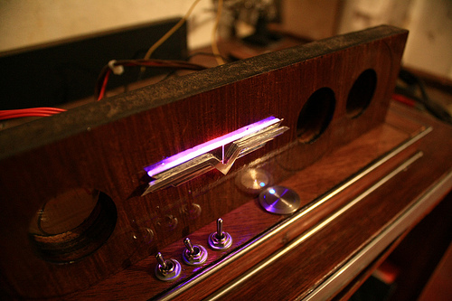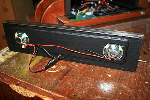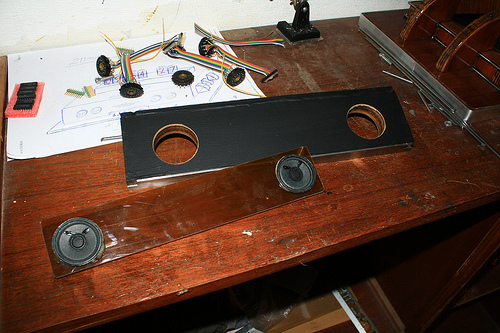 The case is mostly made of wood with aluminium and steel ornaments. The eagle-like front emblem is made of hand-cut aluminium plates fixed against a 5mm thick sanded PVC support, which allows for a nice glowing effect when the backlight is on. The interior of the clock is painted with matte black to avoid parasitic reflections. The base of the clock is covered with rubber plates for great stability.